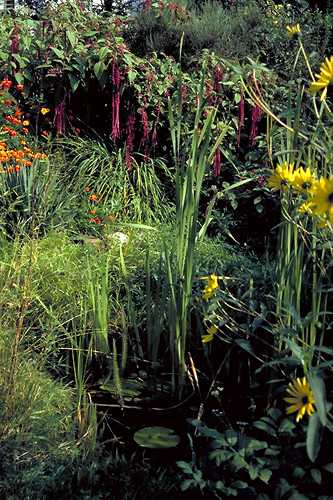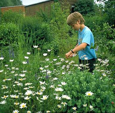 | Auch wenn der Teich kaum zu erkennen ist, beherbergt er doch viele Tiere und ist ein Erlebnisbereich für Kinder. | Ist Ihnen schon einmal aufgefallen, daß Kinder nicht so sehr auf hochgezüchtete Blumen stehen ? Insekten auch nicht. |